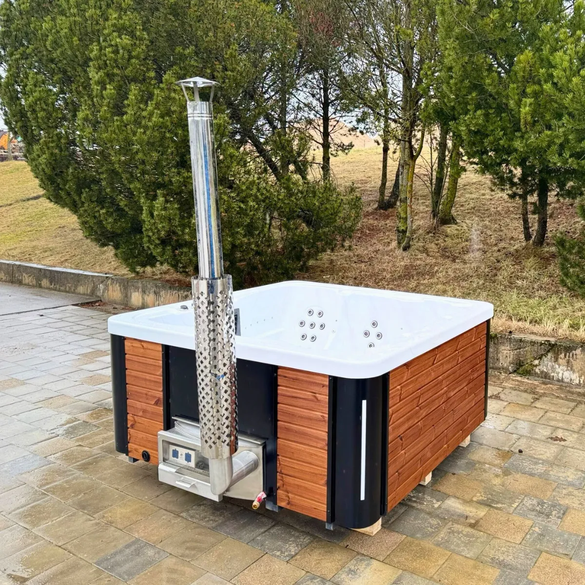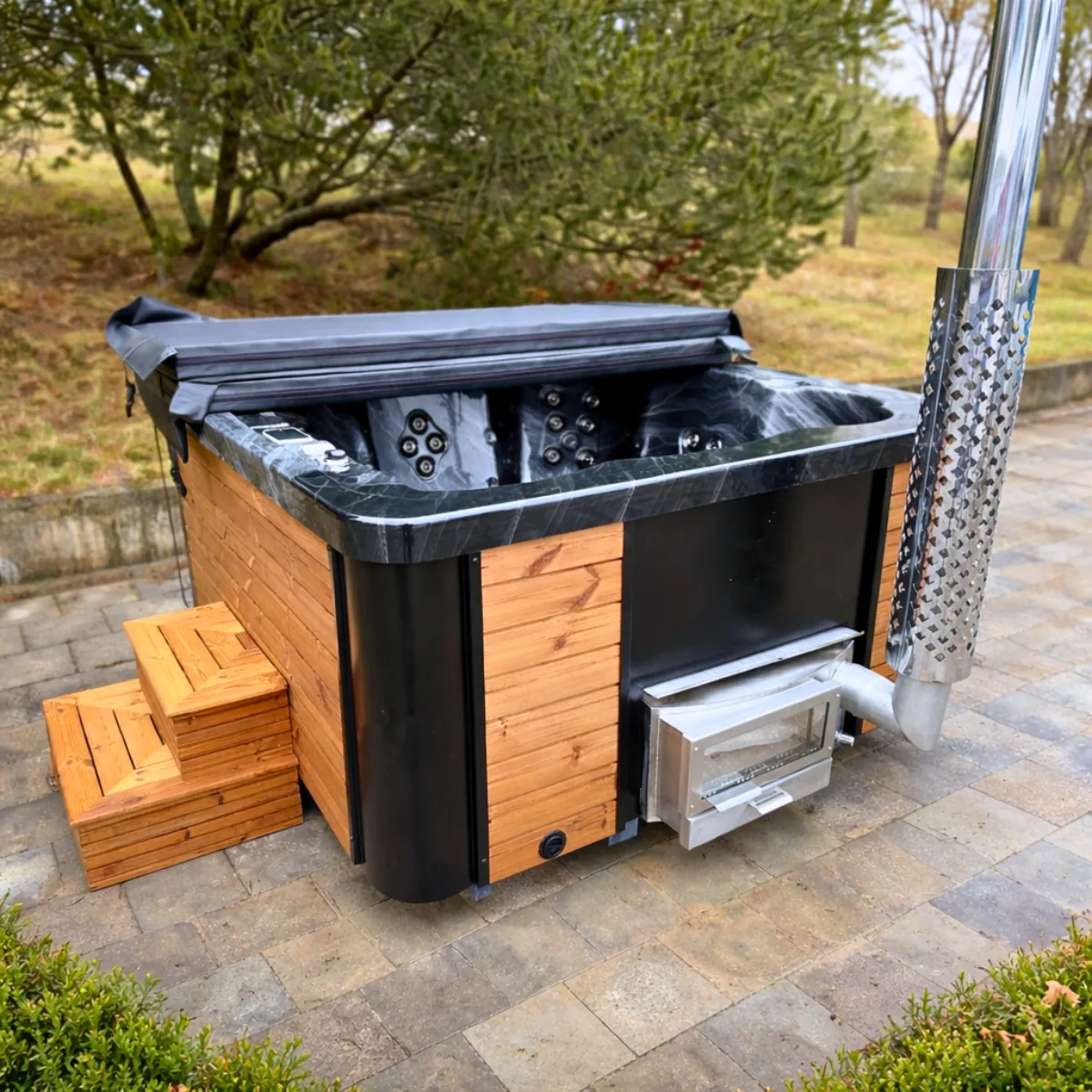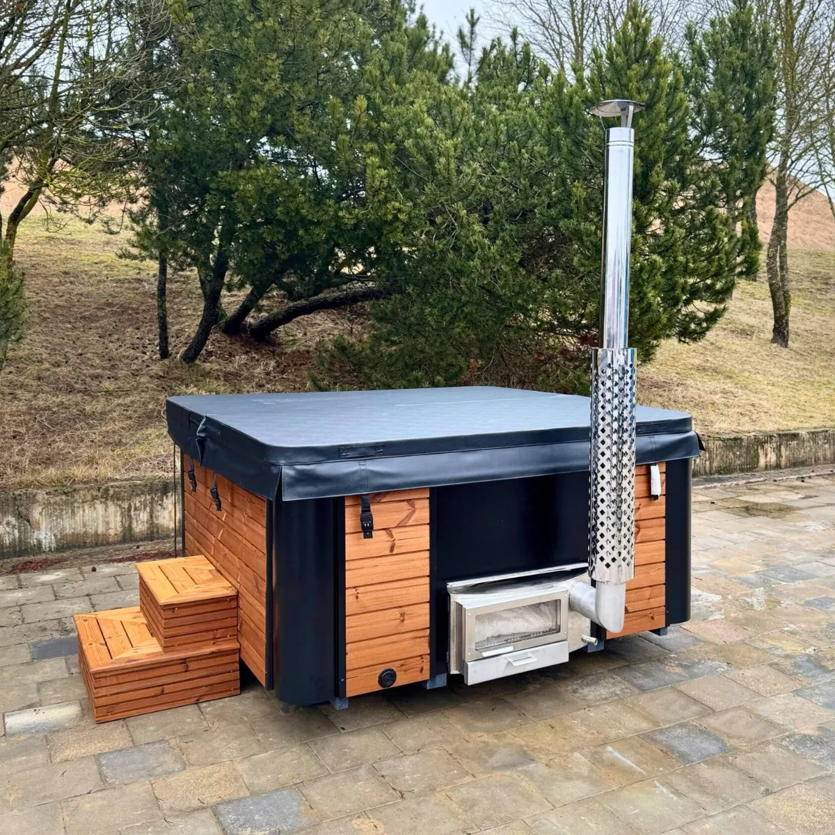 Avec le poêle à bois intégré en inox 304, comptez 2 à 3 heures pour atteindre 38-42°C. Ce délai varie selon la température extérieure, la qualité et la quantité de bois utilisé, et la température de départ de l’eau. En hiver avec une eau froide à 5-10°C, prévoyez plutôt 3 heures. L’isolation en mousse PUR réduit les pertes thermiques et limite la consommation de bois une fois la température atteinte.