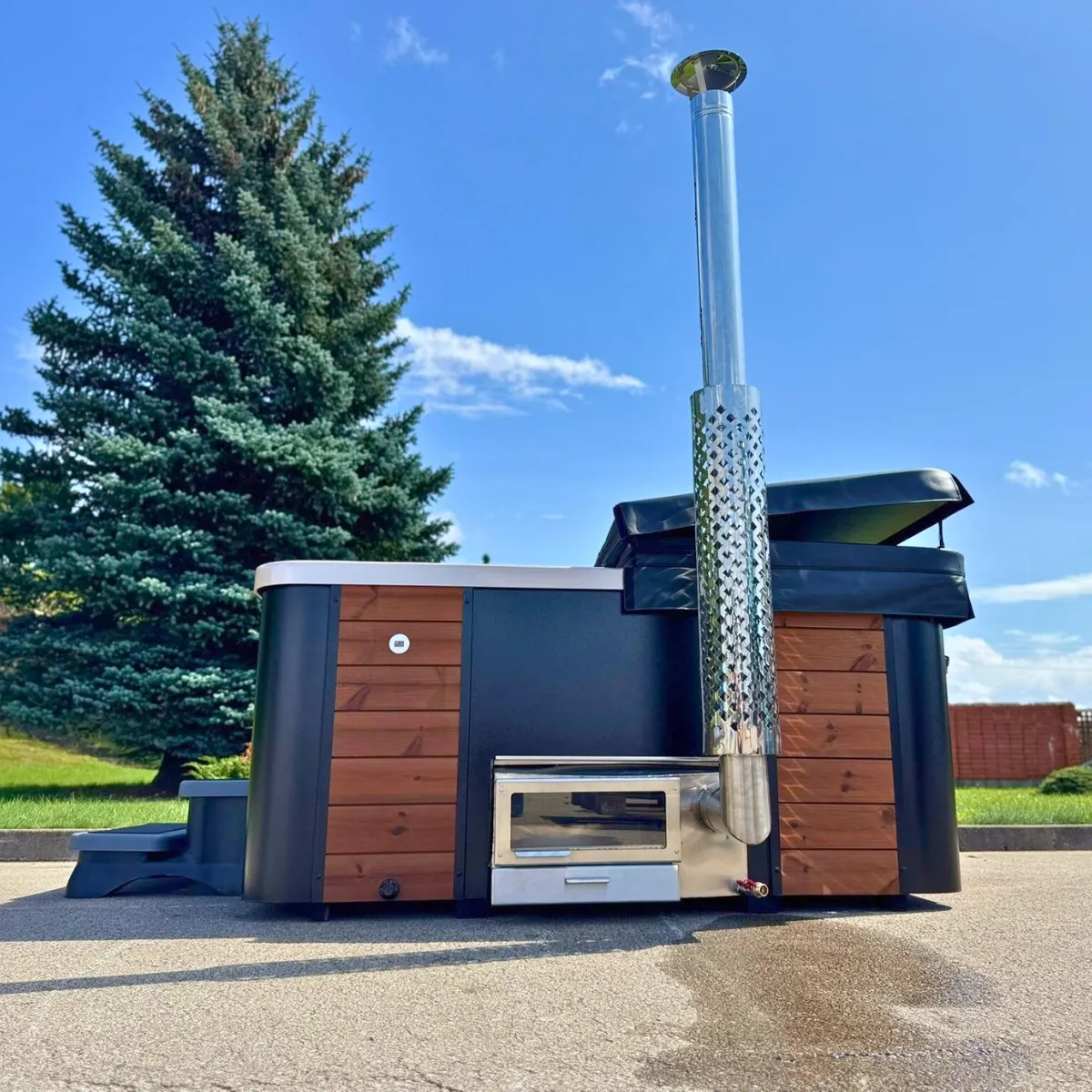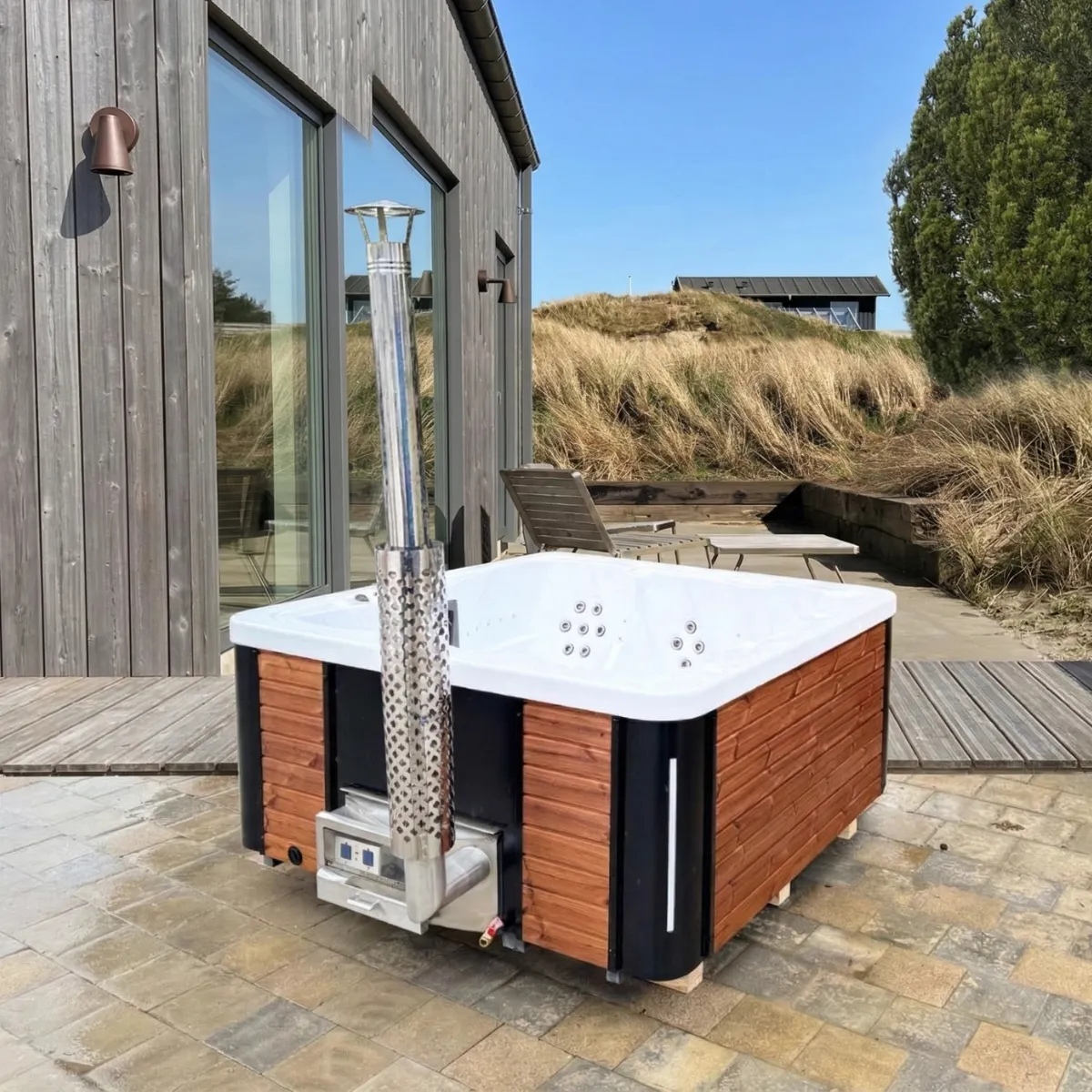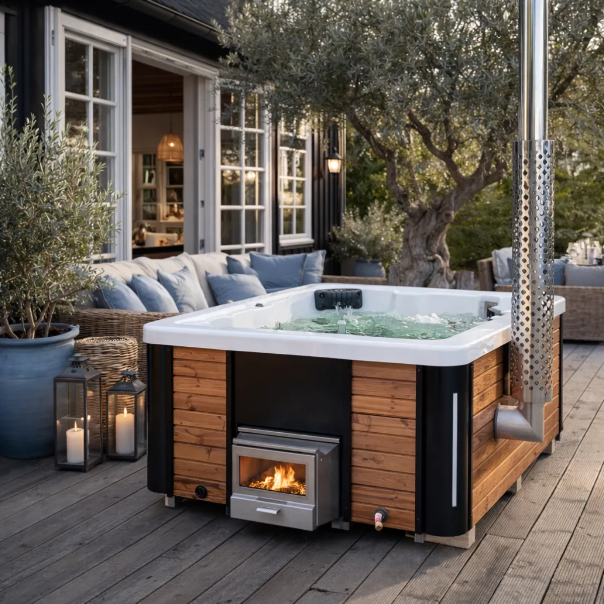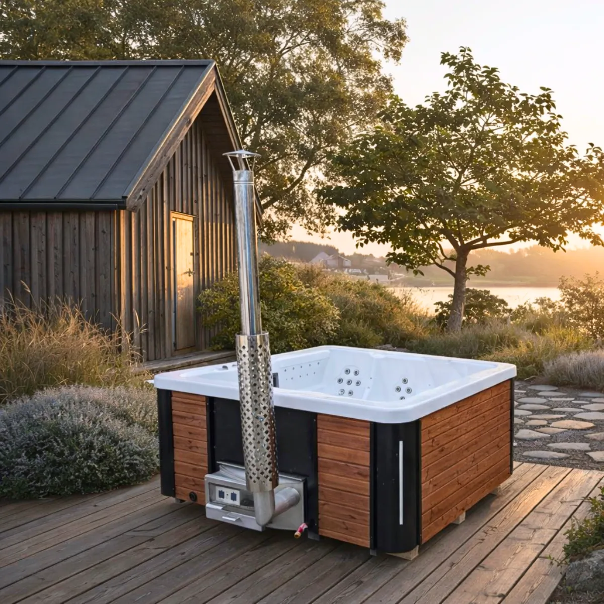 Le chauffage est assuré par un poêle à bois intégré en inox AISI 304, accessible depuis l’extérieur pour le chargement du bois. L’eau monte à 38-42°C en 2 à 3 heures selon la température extérieure et la qualité du bois utilisé. Une fois à température, le chauffage bois maintient une chaleur stable dans les 1 300 litres d’eau. L’enveloppe extérieure est en pin thermo-traité : imputrescible, elle ne nécessite aucun entretien de surface même en exposition permanente aux intempéries.