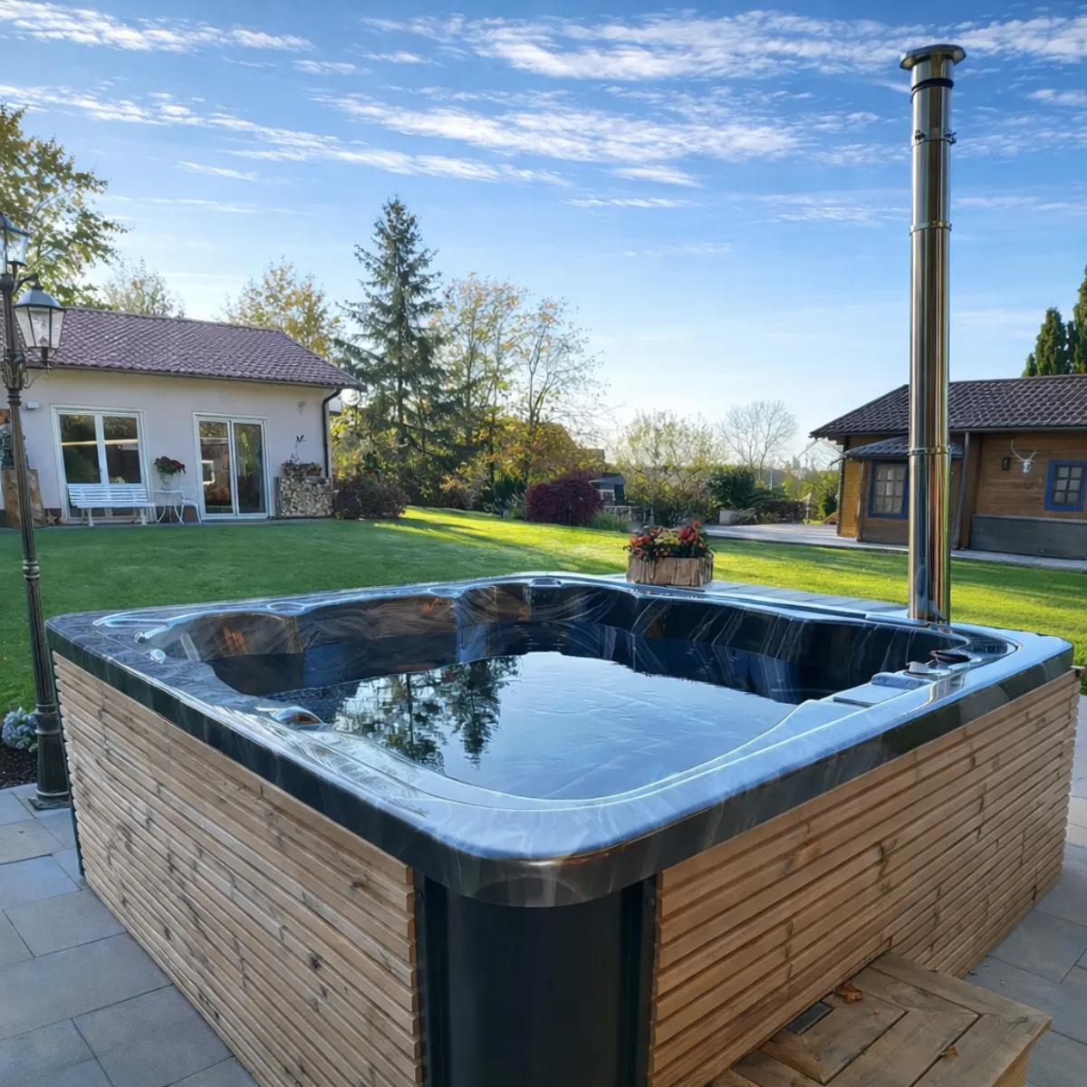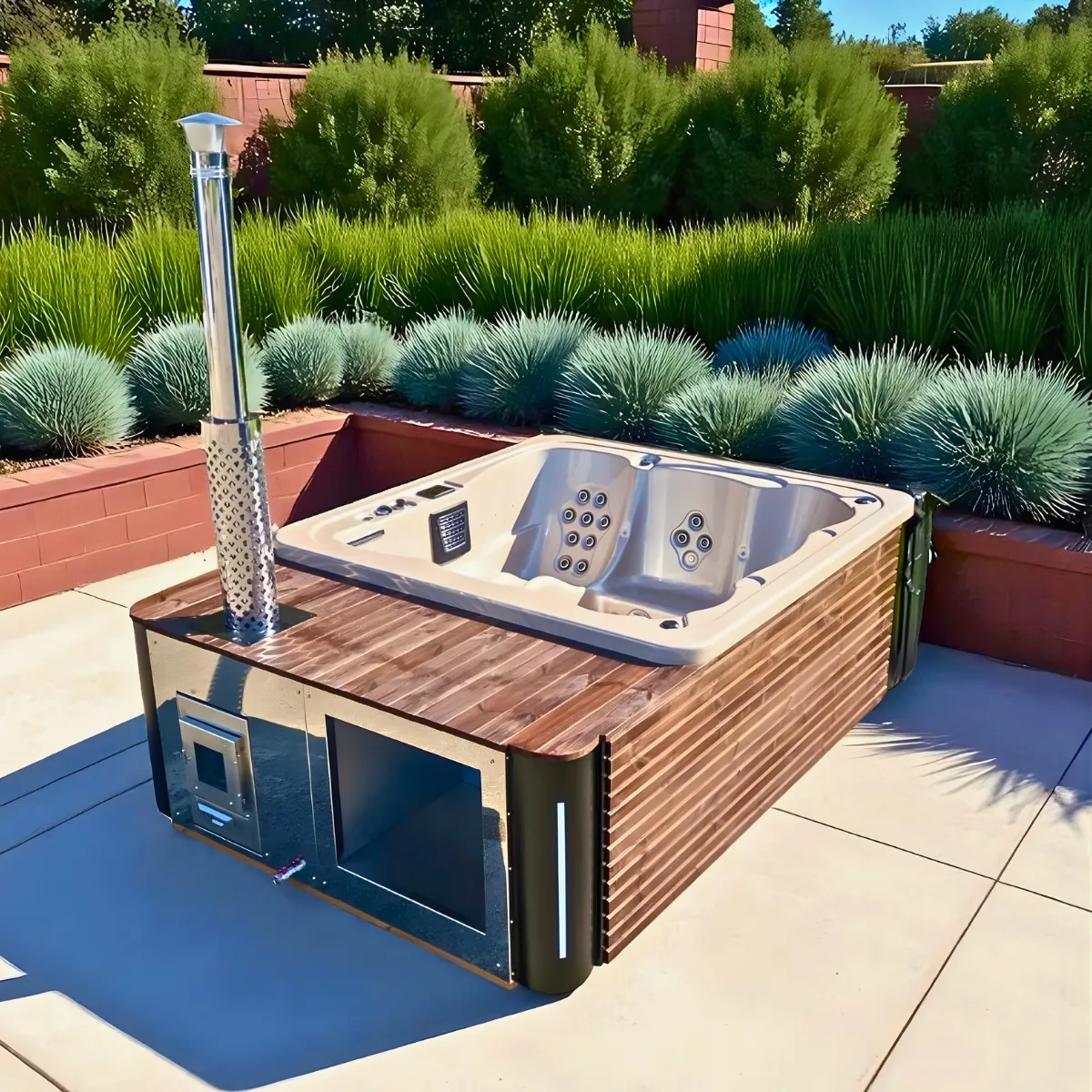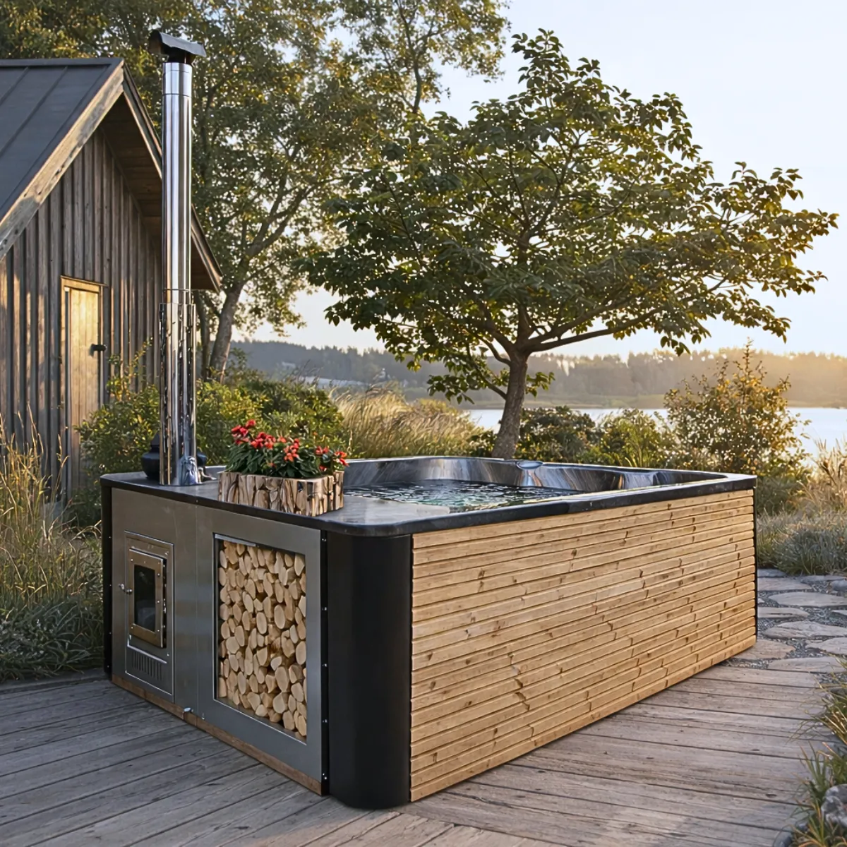 Avec le poêle à bois AISI 316, comptez 2 à 3 heures pour atteindre 38-42°C selon la température extérieure et la qualité du bois. Le chauffage électrique Balboa 3 kW permet de maintenir la température ou de compléter le chauffage bois. L’isolation PU intégrée réduit les pertes thermiques entre les sessions.