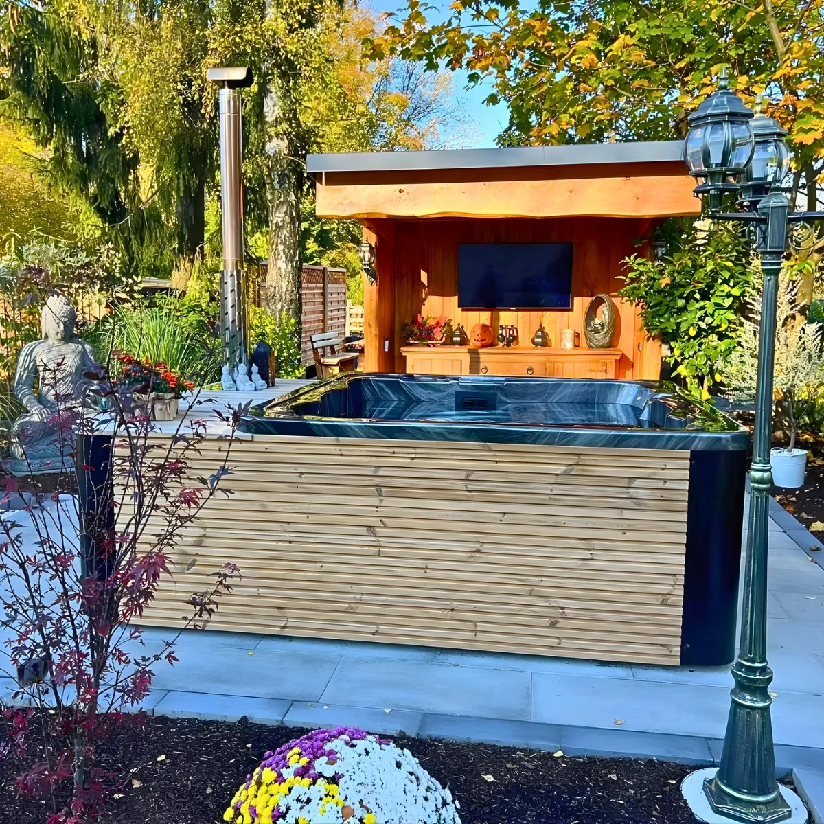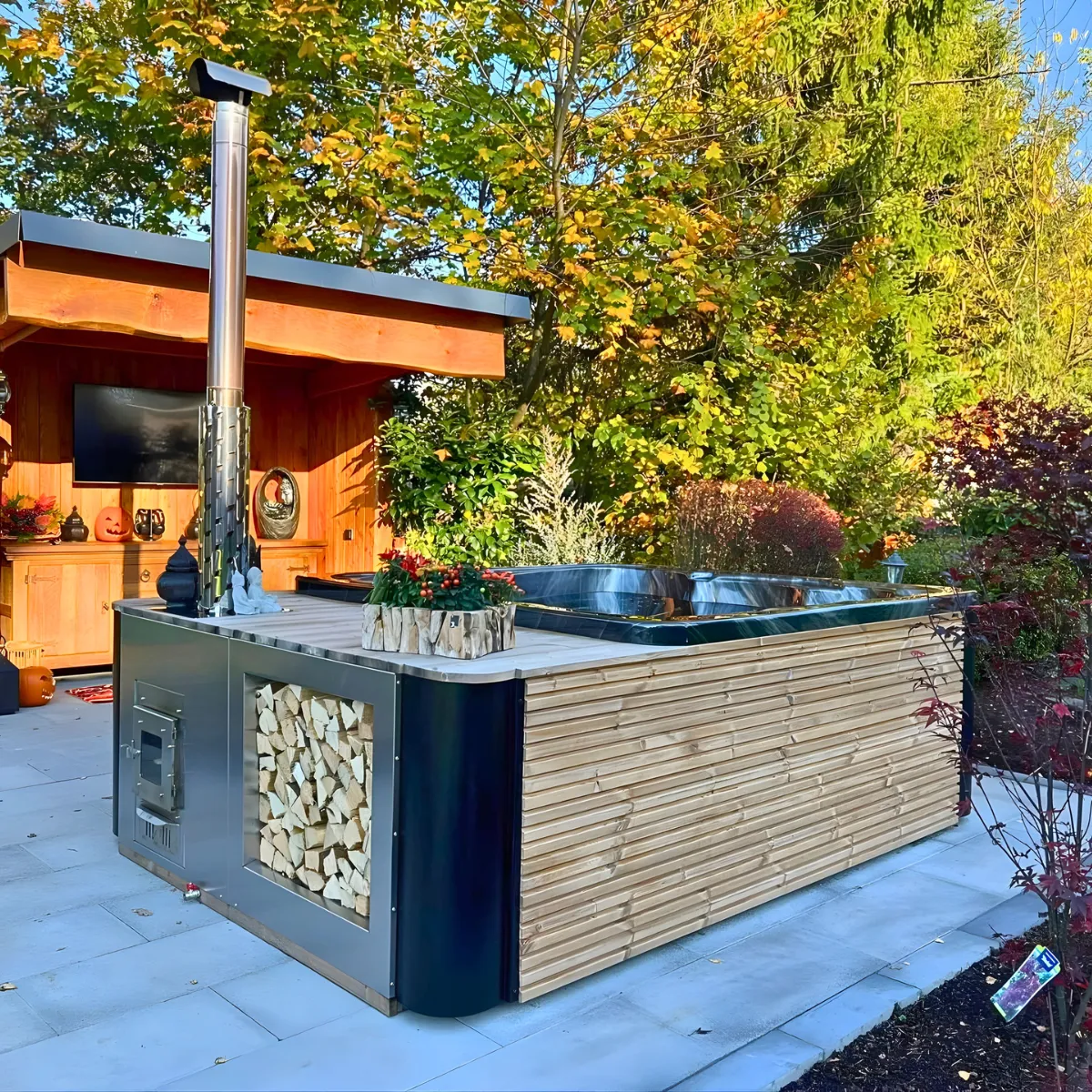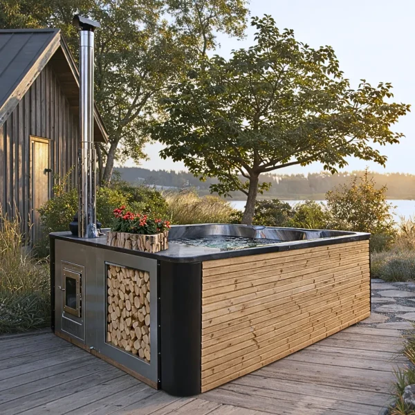 Oui. L’enveloppe en pin thermo-traité est imputrescible et conçue pour une exposition permanente. Le compartiment à bois inox résiste à la corrosion sans entretien. En hiver, si vous ne l’utilisez pas pendant plusieurs semaines, videz complètement la cuve et protégez les systèmes Balboa du gel selon les instructions du manuel. Le couvercle thermique inclus protège l’intérieur entre les sessions.
