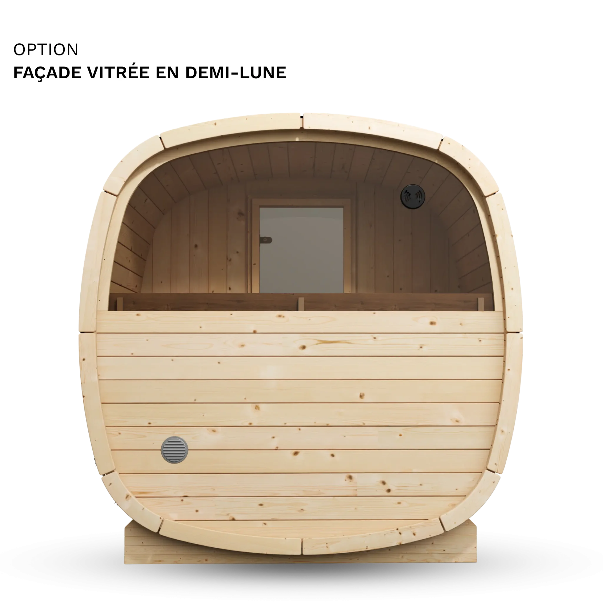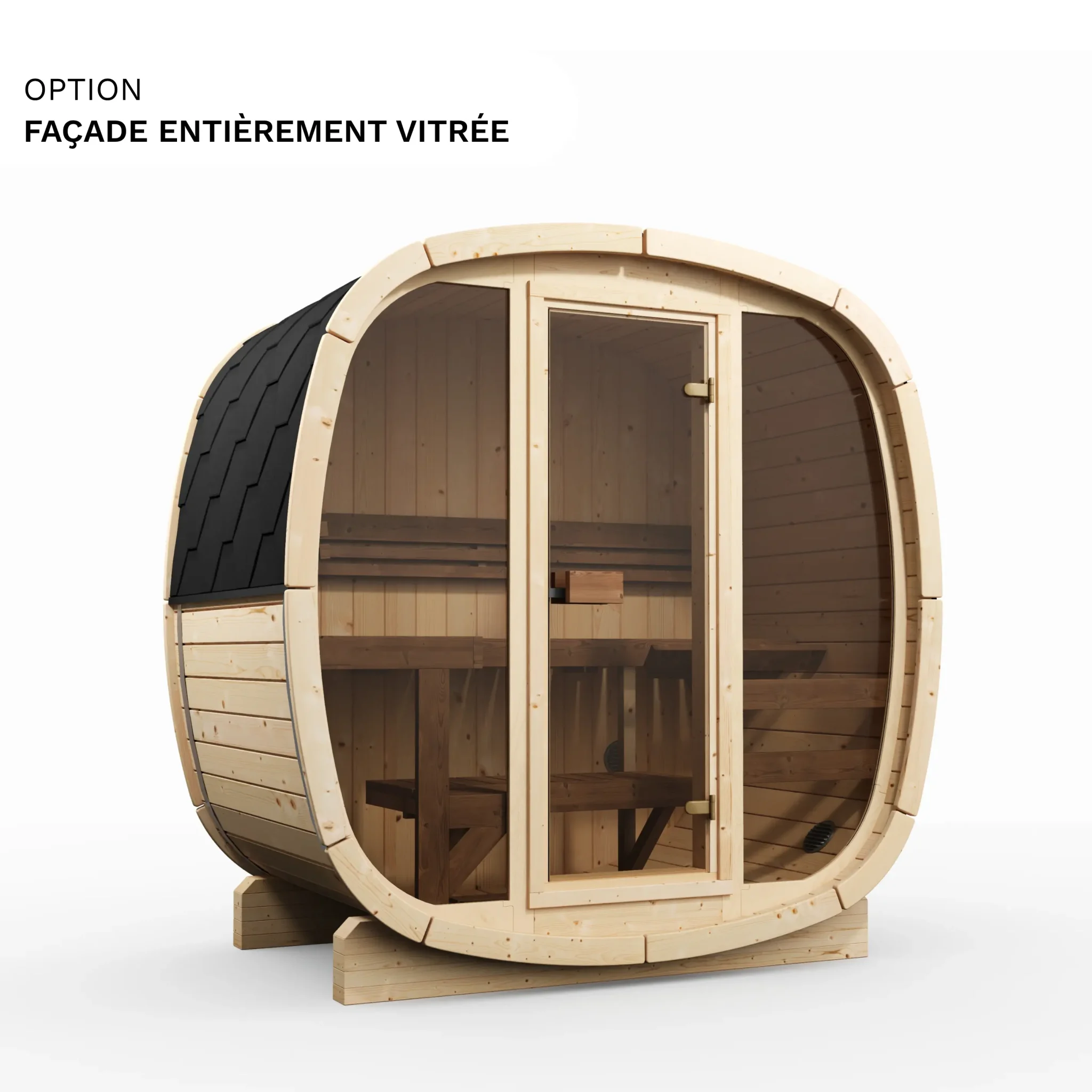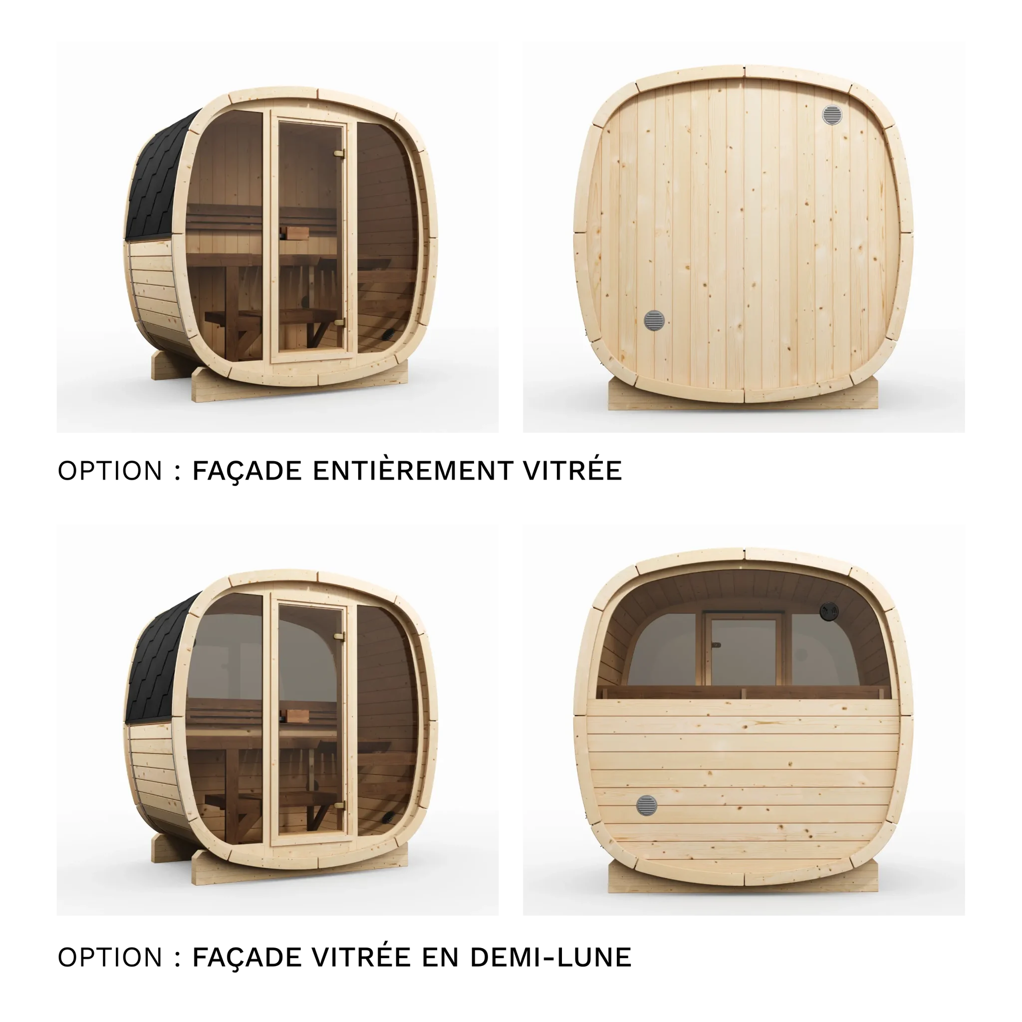 Oui, les deux options sont cumulables. La façade vitrée remplace la porte et les panneaux frontaux par une paroi en verre pleine hauteur, ce qui apporte de la luminosité et un aspect visuel soigné. La vitre arrière en demi-lune est un ajout complémentaire sur la paroi opposée. En combinant les deux, vous maximisez la lumière naturelle à l’intérieur et créez une transparence visuelle traversante intéressante si votre sauna est positionné dans un environnement paysager.