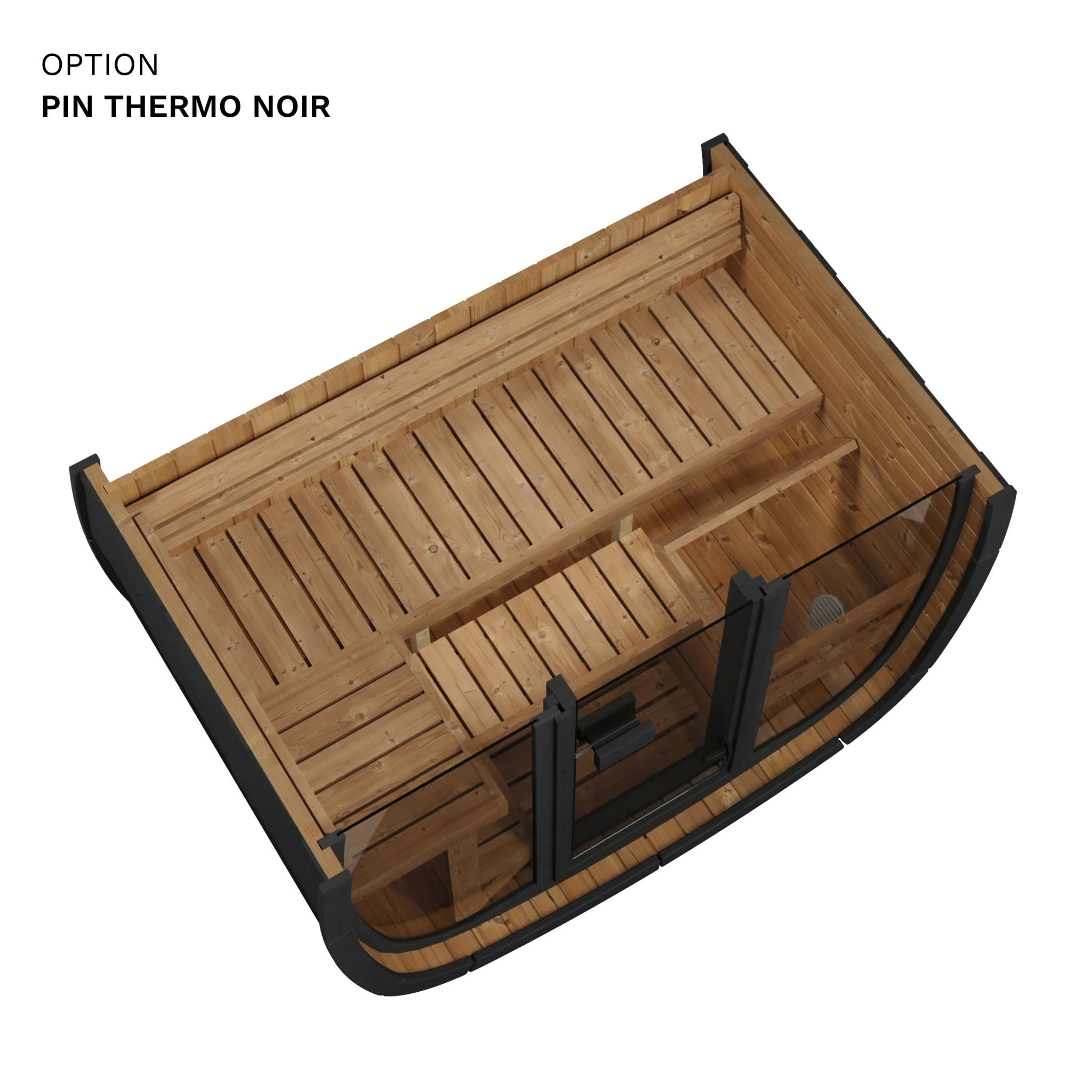 Les options disponibles permettent de configurer le modèle selon vos préférences : façade entièrement vitrée, vitre arrière en demi-lune, bancs en tremble thermo et lumières LED.