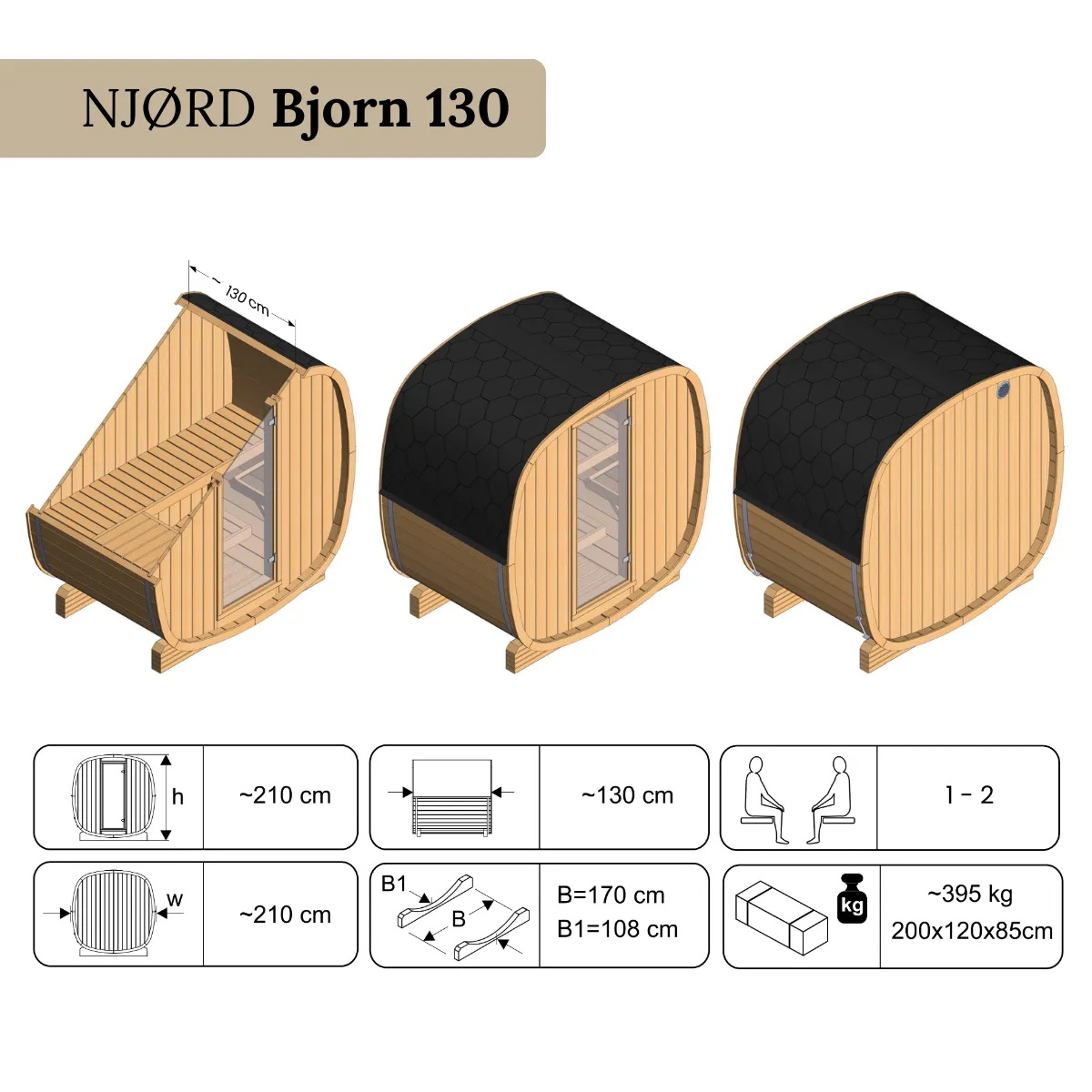 Le Bjorn 130 est le format le plus compact de la gamme baril : avec 130 cm de profondeur, il s’installe dans les espaces où aucun autre modèle ne trouve sa place — petite terrasse, coin de jardin, cour urbaine. Sa forme cylindrique favorise une circulation de la chaleur régulière dans l’ensemble du volume intérieur. Les parois en pin massif 40 mm assurent une bonne rétention thermique. Temps de chauffe : 30 à 45 minutes pour atteindre 80 à 100°C.