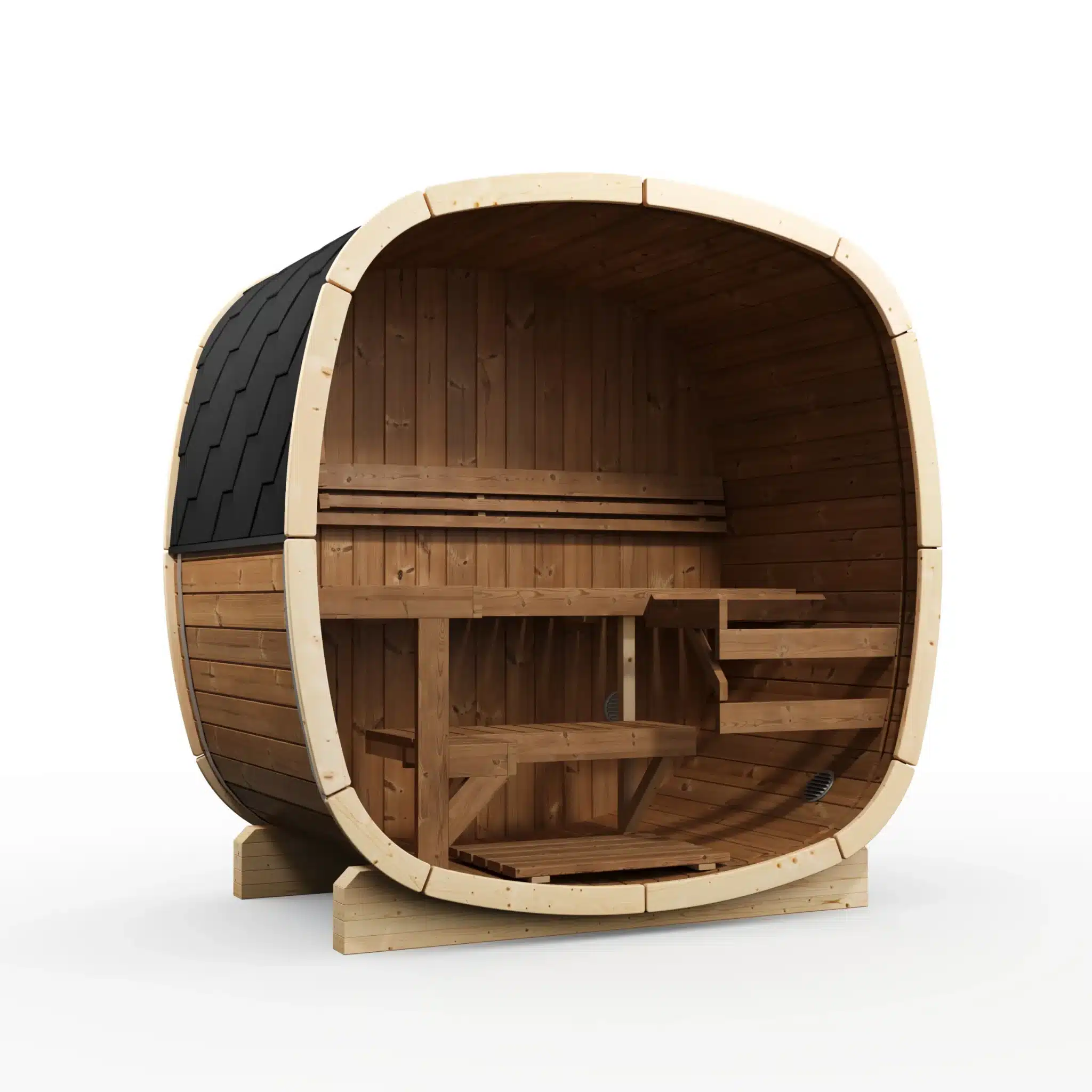C’est possible à condition que la terrasse soit solide et capable de supporter 395 kg de manière répartie. Il faut vérifier les portées structurelles de votre terrasse et s’assurer que l’eau peut s’évacuer correctement en dessous et autour du sauna. Une ventilation sous la structure est recommandée pour éviter toute accumulation d’humidité entre le bas du baril et la terrasse. En cas de doute, une dalle béton au sol reste la solution la plus fiable.