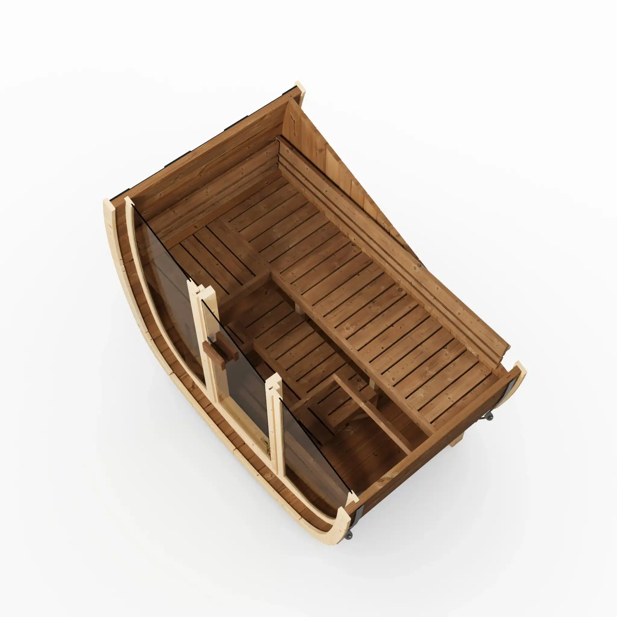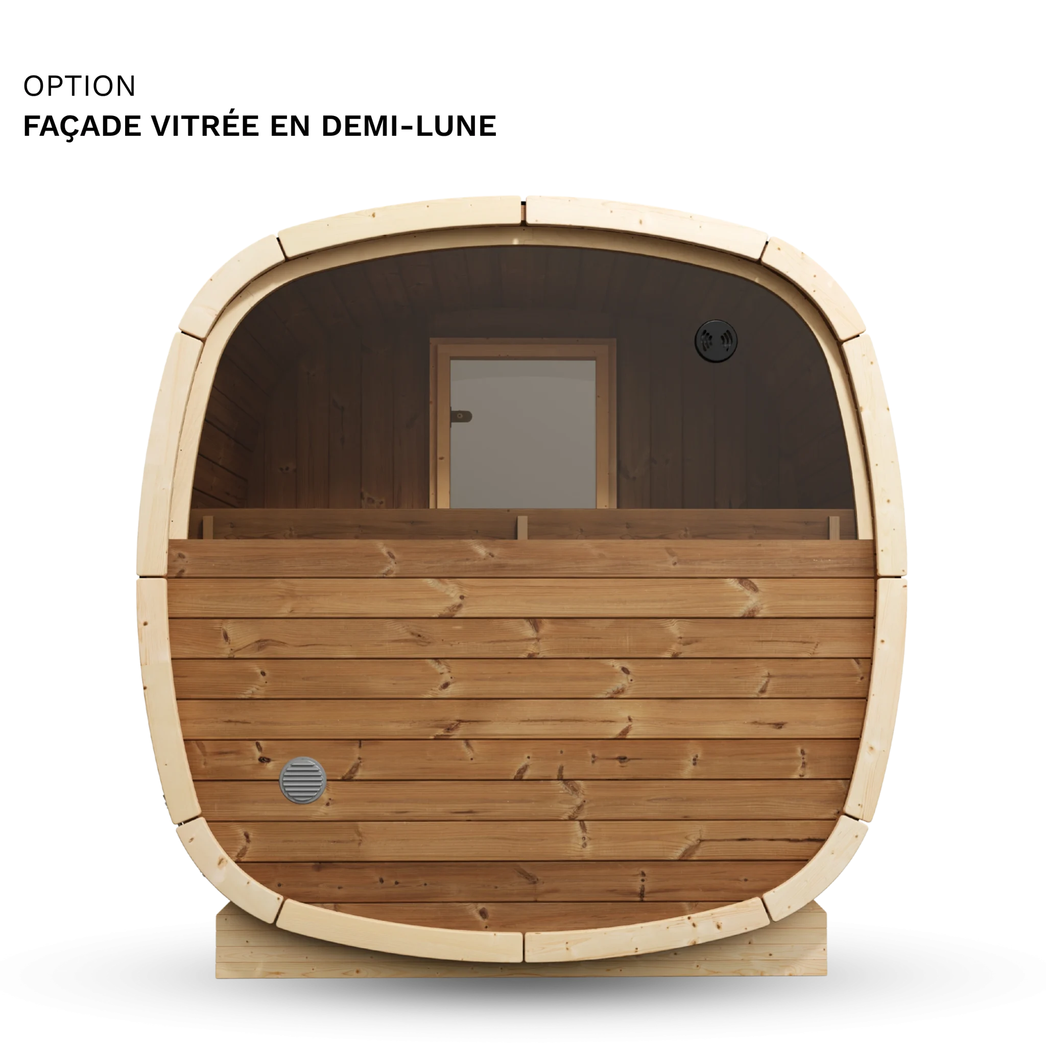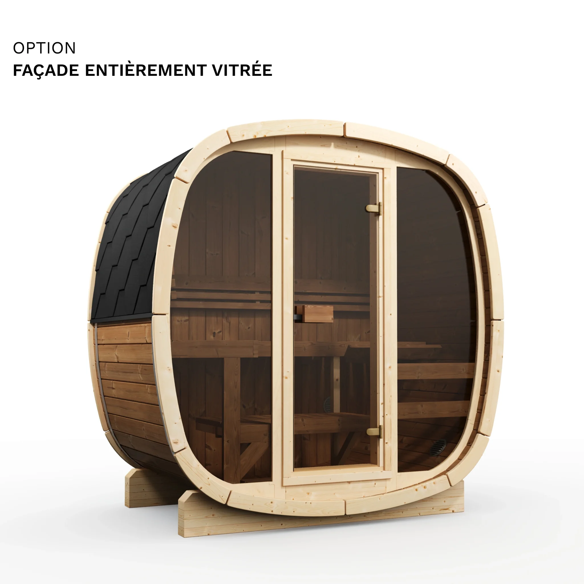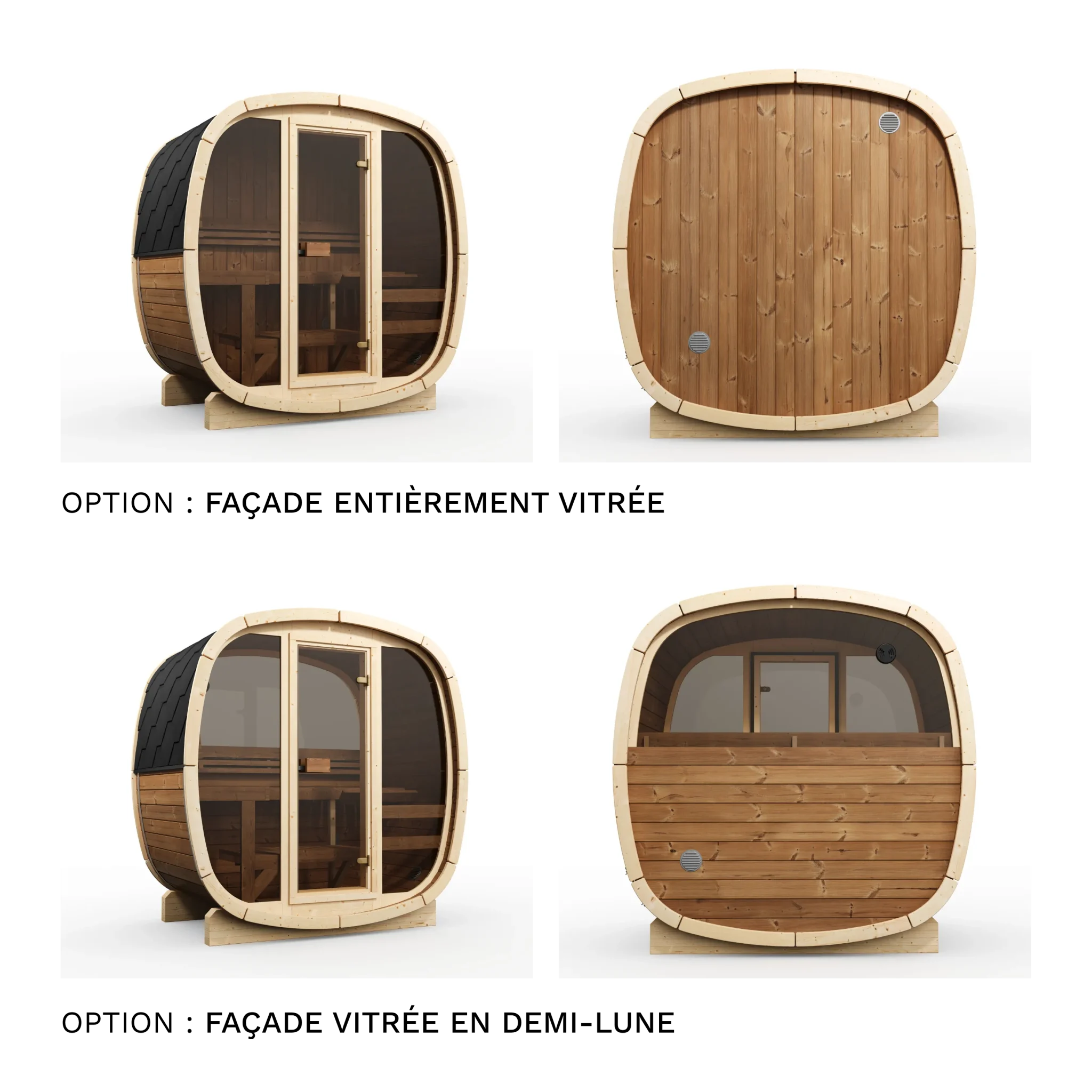 Les options disponibles permettent de personnaliser le modèle selon vos besoins : façade entièrement vitrée, vitre arrière en demi-lune, bancs en tremble thermo et lumières LED.
