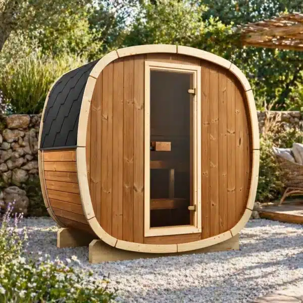 Le sauna extérieur Njord Bjorn 130 Pin Thermo séduit par son format ultra-compact et sa conception en pin thermo-traité, apprécié pour sa résistance naturelle à l’humidité, au gel et aux UV. Sa structure cylindrique et sa teinte brun foncé caractéristique créent une atmosphère intime, idéale pour 2 personnes.