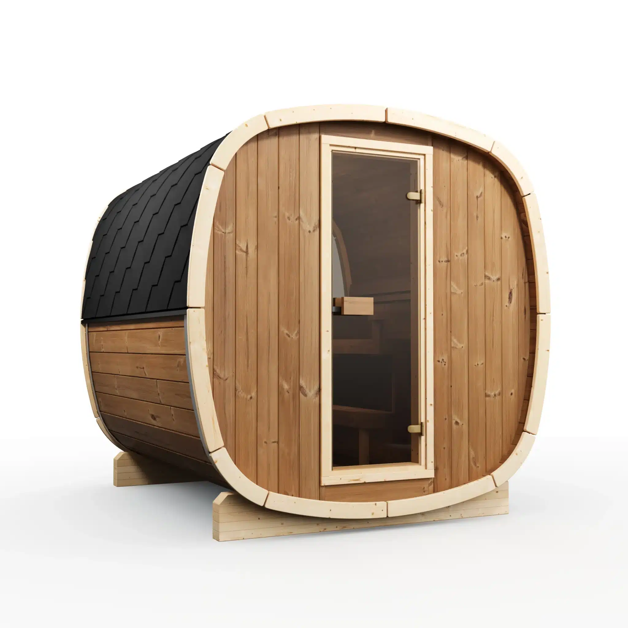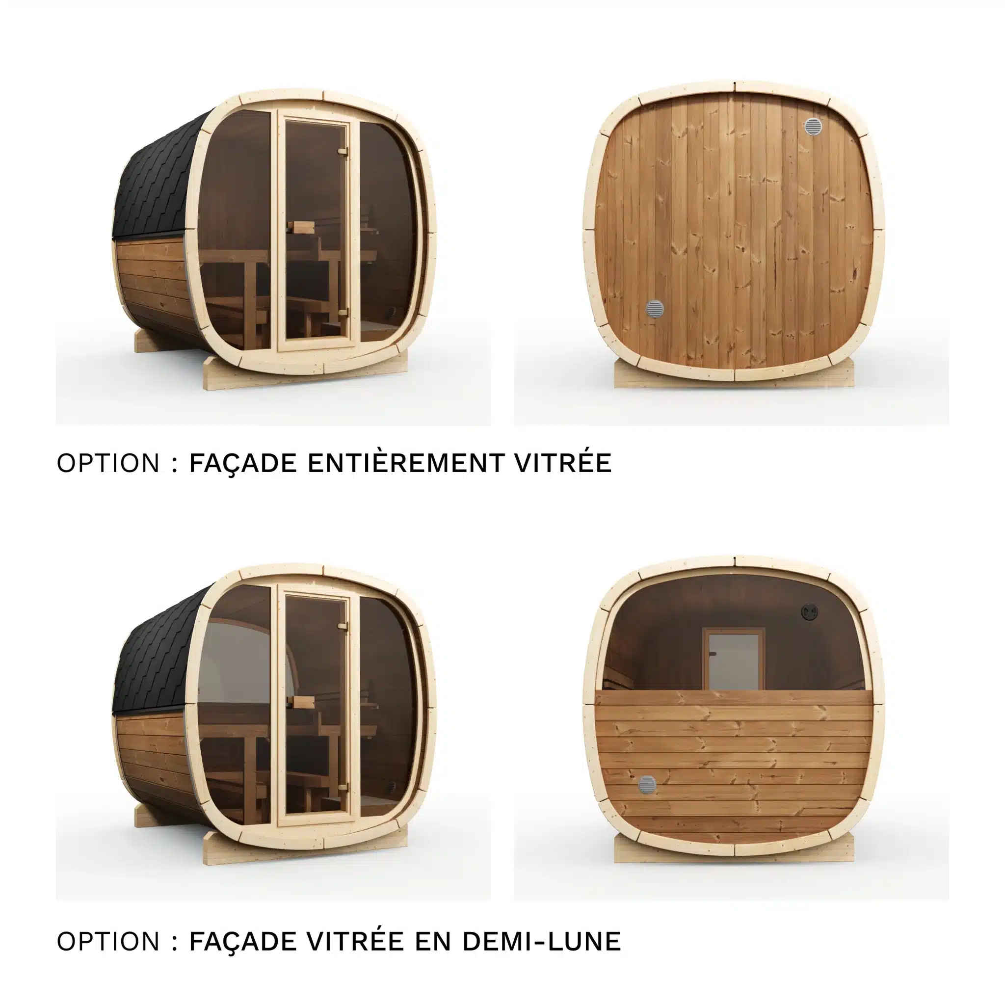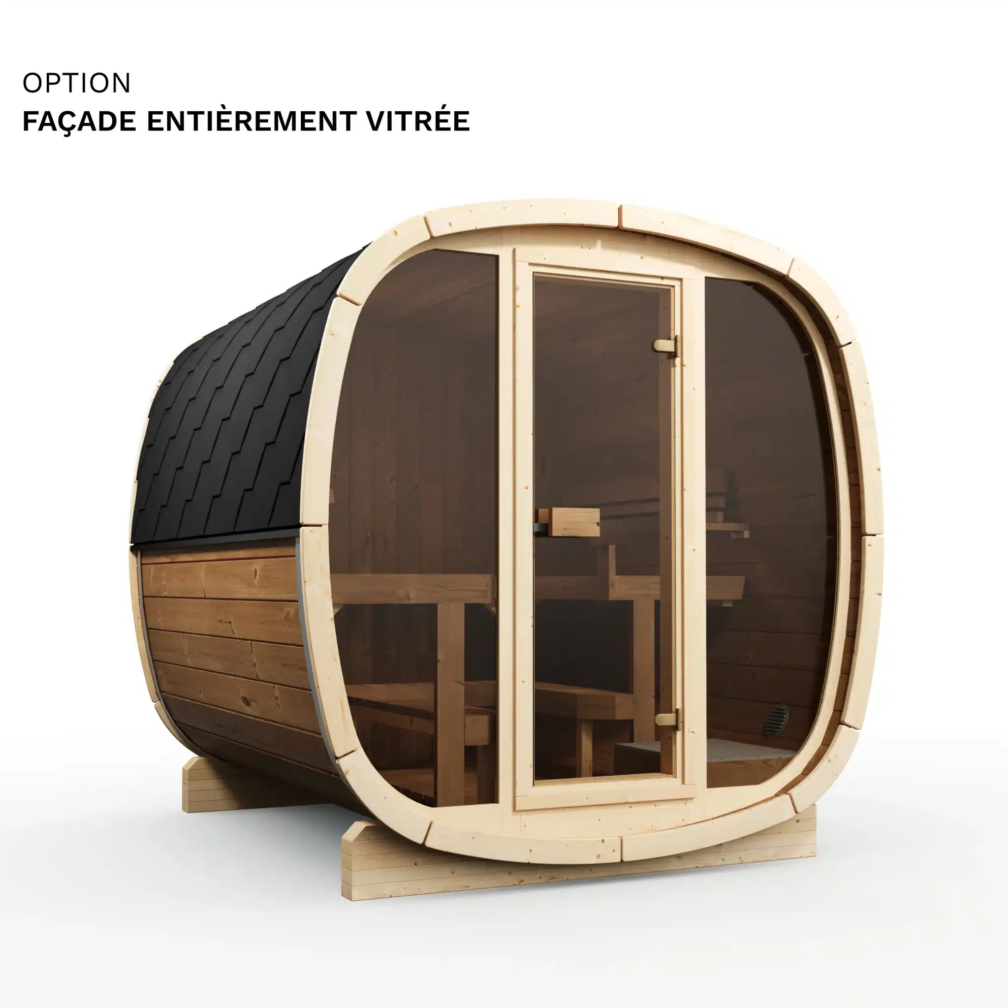 Deux options de chauffage sont disponibles : le poêle électrique Harvia Spirit 9 kW (+990 €) pour un contrôle précis de la température et un démarrage immédiat, ou le poêle à bois Harvia Pro 20 (+1 490 €) pour l’expérience du sauna finlandais traditionnel avec la chaleur du feu de bois. Les deux atteignent 80 à 100°C en 30 à 45 minutes. La puissance de 9 kW est adaptée au volume plus important du 230 par rapport au 160.