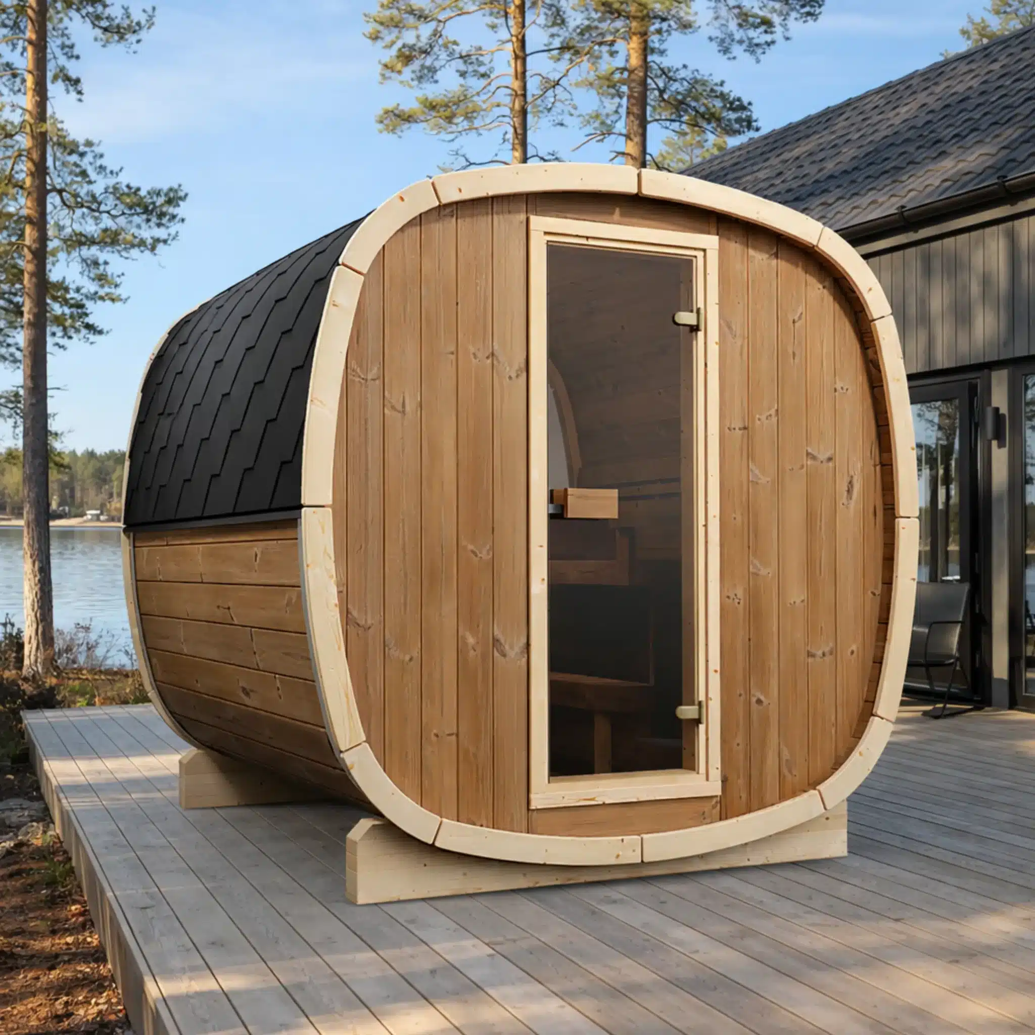 Le Njord Bjorn 230 Pin Thermo est le sauna extérieur baril familial en pin thermo-traité par excellence. Avec 230 cm de profondeur et 210 x 210 cm d’emprise au sol, il offre nettement plus de volume intérieur qu’un baril 160 cm : les bancs permettent de s’allonger confortablement, et la capacité passe à 4-6 personnes. C’est le modèle qui convient aux familles ou aux groupes souhaitant des sessions longues sans se sentir à l’étroit.